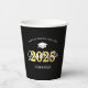 Custom graduation party paper cups featuring a graduate cap, 2025 in faux gold foil, school name, students name, and the word graduate in a script font.