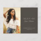 This minimalist graduation announcement postcard features simple typography and a cream and ash brown-grey colour palette. On the front, a vertical photo is displayed on the left side. To the right, "Graduate" is written in modern all caps typography, with the grad's name written in calligraphy below. At the bottom, add the graduate's school and graduation year. The typography is cream against a dark brown-grey background. On the back of the grad postcard you can add a message to recipients and/or graduation party information.