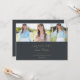 This minimalist graduation announcement features three photos, simple typography, and a charcoal grey and gold colour palette. On the front, the three photos are displayed along the top of the grad card. Underneath the photos, "Graduate" is written in modern all caps typography, with the grad's name written in calligraphy below. At the bottom, add the graduate's school and graduation year. On the back, there is a template for graduation party details. The typography is written in gold against a charcoal grey background on both the front and the back.