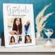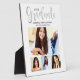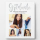 Simply stylish graduation plaque sign with easel features "2025 Graduate" in a trendy silver grey calligraphy script with a modern photo collage of four (4) senior portrait pictures of the grad.
