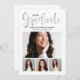 Simply stylish graduation announcement card and party invitation features "Graduate" in a trendy calligraphy script with a modern photo collage of four (4) photos of the grad. Two-sided card design includes "Let's Celebrate" graduation party wording and details on the back. Classic black and white design with silver coloured accents.