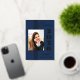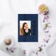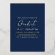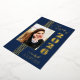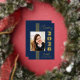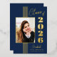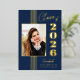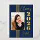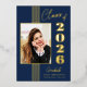 This elegant stylish navy blue Class of 2025 graduation party invitation has real gold foil stripes, photo frame, and text.