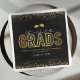 Elegant joint graduation party napkins featuring a stylish black background, faux gold glitter, the saying "lets celebrate the grads" in a script and gold neon sign, faux gold foil mortarboard caps, their names, the school/college they attended, and the class year.