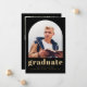 This simple, minimalist graduation announcement features an arch-shaped photo on the front and a horizontal photo on the back. The word "graduate" appears in bold gold-coloured typography, with the graduate's name, school and year in sans serif font on a black background. Add a more detailed message under the photo on the reverse.