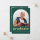 This simple, minimalist graduation announcement features an arch-shaped photo on the front and a horizontal photo on the back. The word "graduate" appears in bold gold-coloured typography, with the graduate's name, school and year in sans serif font on a dark green background. Add a more detailed message under the photo on the reverse.