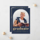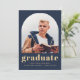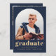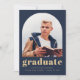 This simple, minimalist graduation announcement features an arch-shaped photo on the front and a horizontal photo on the back. The word "graduate" appears in bold gold-coloured typography, with the graduate's name, school and year in sans serif font on a navy blue background. Add a more detailed message under the photo on the reverse.