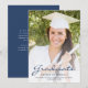 Modern graduation announcement featuring a custom vertical photo. The word "Graduate" appears in navy blue script, with the graduate's name, school and year of graduation below in sans serif font. Easily replace the sample image with your own graduate's photo. A white gradient screen helps ensure the text pops. Add details about your graduate's accomplishments and future plans on the reverse in white text on a solid navy blue background. Ideal for high school or college graduation.