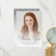 Trendy modern graduation thank-you card featuring a custom vertical photo. The words "Thank You" appear in grey handwriting script overlay, with the graduate's name and year of graduation below in sans serif font. Easily replace the sample image with your own graduate's photo. A white gradient screen helps ensure the text pops. The reverse side features a silver dripping faux glitter border on an ombre background. Customise the text with your own thank-you note, or delete it to provide room for individual handwritten messages.