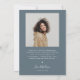 Stylish and modern graduation announcement card to send out to family and friends. There is a steel blue arch frame around your photo. You can add a second picture on the back and the message is editable. The year is written on the side with an illustration of a graduation cap inside the number zero.