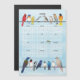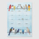 2026 backyard birds calendar - illustration by Sarah Knight. Tea towel sized 2026 calendar featuring backyard birds. Top row: northern cardinal, eastern bluebird, yellow warbler, white breasted nuthatch, chipping sparrow, house wren, cedar waxwing, and Baltimore oriole. Ruby throated hummingbird in middle. Bottom row: common grackle, rose breasted grosbeak, downy woodpecker, purple martin, black capped chickadee, tree swallow, tufted titmouse, and mourning dove.