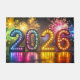 2026, colourful New Year celebration with fireworks in background.