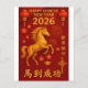 The front of the card showcases “Happy Chinese New Year 2026” alongside the Chinese phrase 馬到成功 (“Success Arrives with the Horse”), while the back of the card offers a refined red and gold greeting with the Chinese characters 新年快乐 (“Happy New Year”).