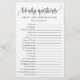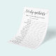 Have some fun at your shower with this twenty questions game. Add your own questions and personalised text using the template form or leave it as is. Use the "Customise Further" feature to change the background colour and script heading to match your party theme. Use the matte paper option for writing on.