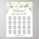 This 20 table wedding seating chart features a beautiful rustic boho chic design with hand painted watercolor roses, flowers, and blossoms in shades of ivory, white, and cream, along with sage green eucalyptus leaves and foliage. The title reads "Welcome! please find your table" in lacy script calligraphy. There is space for the names of the couple and wedding date. This chart has table assignments for 200 guests with 10 seats per table. Beautiful way to welcome your guests to your reception while making it easy for them to find their seats.