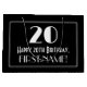 This vintage look 1920s/1930s style inspired birthday themed giftbag design features a large art deco style inspired number "20", the message "Happy 20th Birthday,", a personalised name, and a border pattern consisting of thin lines. The background is coloured black. A birthday themed gift bag like this might be used when giving a gift or present in celebration of somebody’s 20th birthday. [~Z0000496]