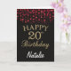 20th Birthday Black and Red Gold Glitter Card with personalized name. For further customization, please click the "Customize it" button and use our design tool to modify this template.