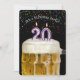 Number 20 candle in mug of beer with colourful confetti on black for 20th birthday party invite.