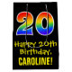 This fun, exciting, and colourful birthday-themed giftbag design features a large number "20" with a rainbow spectrum gradient style pattern, along with the message "Happy 20th Birthday,", and a custom recipient name. It also has a black-coloured background. A fun giftbag like this might be used when wrapping presents being given to somebody in celebration of their twentieth birthday. [~Z0000512]