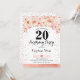 20th birthday party invitation. Elegant design in faux glitter rose gold with floral accent. Invite card with script font and confetti. Blush coral pink, white. Perfect for a stylish thirtieth bday celebration. Message me if you need custom age.