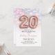 20th birthday party invitation. Elegant design in faux glitter rose gold with pastel pink and purple lights. Invite card features gold number 20 balloons and script font. Perfect for a stylish bday celebration. Message me if you need custom age.