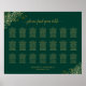 This beautiful seating chart will help your guests find their assigned tables at your wedding reception. It features a simple yet elegant design with gold text on a lush emerald green background. The title is written in script calligraphy lettering and reads: please find your table. The chart is decorated with a frilly floral faux foil gold filigree in the corners. Contains seating assignments for 21 tables at 10 guests per table or 210 guests.