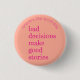 Celebrate in style with our fun and festive button from the Bad Decisions 21st Birthday collection. Perfect for friends and party guests, this button features the playful slogan "Bad decisions make good stories" in bright pink text against a vibrant coral background. Ideal for adding a touch of whimsy to your party attire, this button helps create a sense of camaraderie and celebration among guests. Made from durable materials with a secure fastening, this button is a delightful keepsake to commemorate the big day and ensure everyone feels part of the fun.