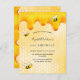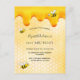 Elegant, fun, 21st birthday summer party invitation. Yellow, white background with a honeycomb pattern. Decorated with golden, dripping sweet honey and happy bumble bees. The name is written with a modern hand lettered style script. Black letters. Perfect for a summer tea party in a garden, backyard.