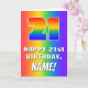 The front of this exciting and joyful birthday-themed greeting card design features a large number “21” with a rainbow spectrum inspired gradient pattern, along with the message “HAPPY 21st BIRTHDAY,”, and a customisable name. The background on the front also has a cheerful multicolored rainbow spectrum gradient pattern. The inside has an editable birthday greeting message, or could perhaps be cleared and left blank if a message is to be written by hand instead. A joyful, personalised birthday greeting card like this might be sent to celebrate somebody’s twenty-first birthday. [~Z0000570]