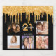 For a 21st birthday party, celebrating her life with a collage of 5 of your own photos. Personalise and add a name, age 21 and a date. Date of birth or the date of the party. White and golden coloured letters. Classic black background colour, decorated with faux gold glitter drips, paint dripping look.