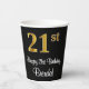 This elegant, stylish, and luxurious birthday themed paper cup design features a large ordinal number “21st” having a faux/imitation gold-like gradient pattern, along with the birthday greeting message “Happy 21st Birthday,” and an editable name in a script-style font. The background is coloured black. Paper cups like this might be use at a birthday party for somebody who is celebrating their twenty first birthday. [~Z0000538]
