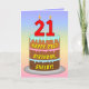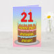 This cheerful and upbeat birthday-themed greeting card design features a cartoon-style depiction of a three-tier birthday cake having number-shaped candles on top showing the age “21“, along with the message “HAPPY 21ST BIRTHDAY,”, and a custom recipient name. The background of the front features a multi-colour pastel rainbow spectrum inspired gradient pattern. The inside has an editable birthday greeting message, or could perhaps be cleared and left blank if a message is to be written by hand instead. A colourful, editable birthday greeting card like this might be a fun way to send birthday greetings to somebody who is celebrating their twenty-first birthday. [~Z0000625]