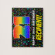 This colorful and bold birthday jigsaw puzzle design features a large number “21” with a multicolored rainbow spectrum inspired gradient pattern, along with the message “HAPPY 21st BIRTHDAY,”, and a personalized recipient name. The background features an upbeat pattern of musical notes of various sizes and colors. A fun, editable birthday puzzle like this might be a fun way to send birthday wishes to somebody who is celebrating their twenty-first birthday. These might be extra special if that person is a singer, a songwriter, a musician, a composer, or a lover of music. [~Z0000608]