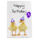 Cute fluffy yellow ducklings with confetti, party hats, and purple balloon on a white background for a 21st birthday.