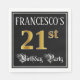 This ornate and fancy birthday-themed paper napkin design features a personalized name and the message “21st Birthday Party”. The large number “21st” has a faux/imitation gold-inspired coloring pattern, and the words “Birthday Party” are in opulent script-style text. The background is colored black by default (although it can be customized). Opulent, luxurious paper napkins like this might be used at a birthday celebration/party being held to celebrate somebody’s 21st birthday. [~Z0000565]