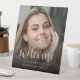 This custom 21st birthday party welcome sign features the guest of honour's personalised photo, name, and birthday, along with the word "welcome" in elegant gold-coloured calligraphy script. A dark screen helps make the text pop. A great way to celebrate someone who's turning 21!
