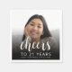This custom 21st birthday napkin features the guest of honour's personalised photo, name, and birthday, along with the word "Cheers" in elegant white calligraphy script. A dark screen helps make the text pop. A great way to celebrate someone who's turning 21!