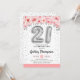 21st birthday party invitation. Elegant design in faux glitter silver with floral accent. Invite card with silver number 21 balloons, script font with confetti. Blush coral pink, white. Perfect for a stylish bday celebration. Message me if you need custom age.