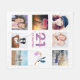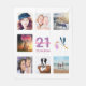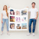 A gift for a woman's 21st birthday, celebrating her life with a collage of 8 of your photos. Templates for a name, age 21 and a date. Date of birth or the date of the anniversary. Pink and purple coloured letters. White coloured background.