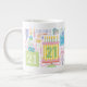 A 21st birthday gift mug with bright pastels colour palette of pink, green, blues and purples . Pretty and feminine with the custom number 21 on birthday cakes, presents whimsical flowers.