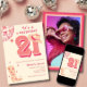 Celebrate a memorable 21st birthday with a personalised invitation that exudes retro charm! This digital download features an ivory background adorned with a disco ball, stars, a cowboy boot, and a bold number 21 in shades of peach and pink, complete with a whimsical cowboy hat hanging on it. On the back add a picture of the birthday girl to customise. Perfect for a disco cowgirl or rodeo-themed birthday party, this invitation is sure to set the tone for a fun and festive celebration. Get ready to party in style with this unique and eye-catching design in peach and pink tones!
