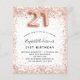 For an elegant 21st birthday. A white background. Decorated with rose gold, pink faux glitter, sparkles. Personalise and add a name, and party details. The name is written with a hand lettered style script, number 21 with balloon style fonts.
