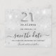 A girly and trendy Save the Date for a 21st birthday party. A modern faux silver looking background decorated with faux glitter dust. Personalise and add a date and name/age. Grey coloured letters. The text: Save the Date is written with a large trendy hand lettered style script. Number 21 with a balloon style font.
