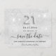 A girly and trendy Save the Date card for a 21st birthday party. A modern faux silver looking background decorated with faux glitter dust. Personalise and add a date and name/age. Grey coloured letters. The text: Save the Date is written with a large trendy hand lettered style script. Number 21 with a balloon style font.