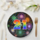 This fun, colourful, and cheerful paper plate design features a large number "21" coloured with a rainbow spectrum gradient inspired pattern. It also features a vibrant and exciting bursting celebratory fireworks inspired pattern. It has a black coloured background. Fun paper plates like this might be used at a celebration being held in honour of somebody’s twenty first birthday, a 21st anniversary, or some other twenty first event. [~Z0000490]