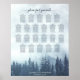 This elegant 22 table wedding seating chart features a rustic homey design with a woodland scene of a foggy or misty hillside covered in blue mountain pine trees. The title reads "please find your table" in lacy script calligraphy. There is space for the couple's names and wedding date. This chart has table assignments for 220 guests 10 people per table. Perfect for an outdoor or wilderness destination wedding.