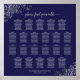 This simple yet elegant wedding seating chart contains space for 220 names at 22 tables with the traditional 10 seats per table. The navy blue design features a pale grey script calligraphy title, and silver faux foil lacy frills in the corners. Wonderful way to help your guests find their tables while adding class, elegance, and style to your wedding reception.