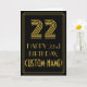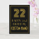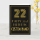 The front of this Roaring Twenties inspired birthday-themed greeting card design features a large Art Deco style inspired number "22", the message "HAPPY 22nd BIRTHDAY,", a personalised name, and a border pattern consisting of lines. The inside features a custom birthday greeting message, or could perhaps be cleared and left blank if a message is to be written by hand instead. A customisable birthday card like this might be a fun way to send a message in celebration of somebody’s twenty second birthday. [~Z0000394]
