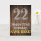 This American Wild West inspired and country look birthday greeting card design features a large rustic look number "22", the message "Happy 22nd Birthday,", a custom name, and a faux/imitation wood grain inspired look pattern background. The inside has an editable birthday greeting message, or could perhaps be cleared and left blank if a message is to be written by hand instead. An editable birthday greeting card like this might be sent in celebration of somebody’s twenty-second birthday. [~Z0000469]