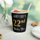 This ornate and fancy birthday themed paper cup design features a customizable name and the message “22nd Birthday Party”. The large number “22nd” has an imitation/faux gold-inspired coloring pattern, the words “Birthday Party” are in elegant script-style text, and the background is colored black by default (although it can be customized). Elegant, opulent paper cups like this might be useful at a birthday celebration being held in celebration of somebody’s twenty second birthday. [~Z0000567]