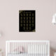 This wedding seating chart features table assignments for 230 guests, with 10 people at each table. The design is simple yet elegant with frilly gold faux foil curls and swirls in the corner and elegant gold calligraphy reading "please find your table" on a black background.
